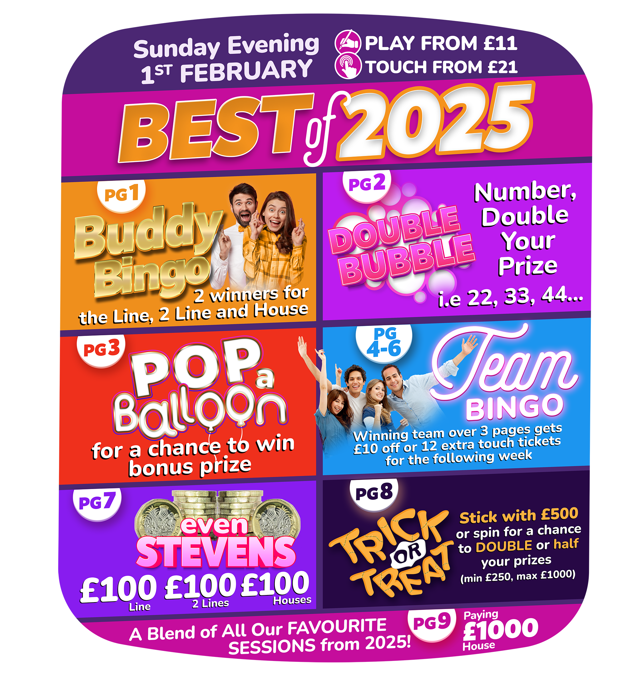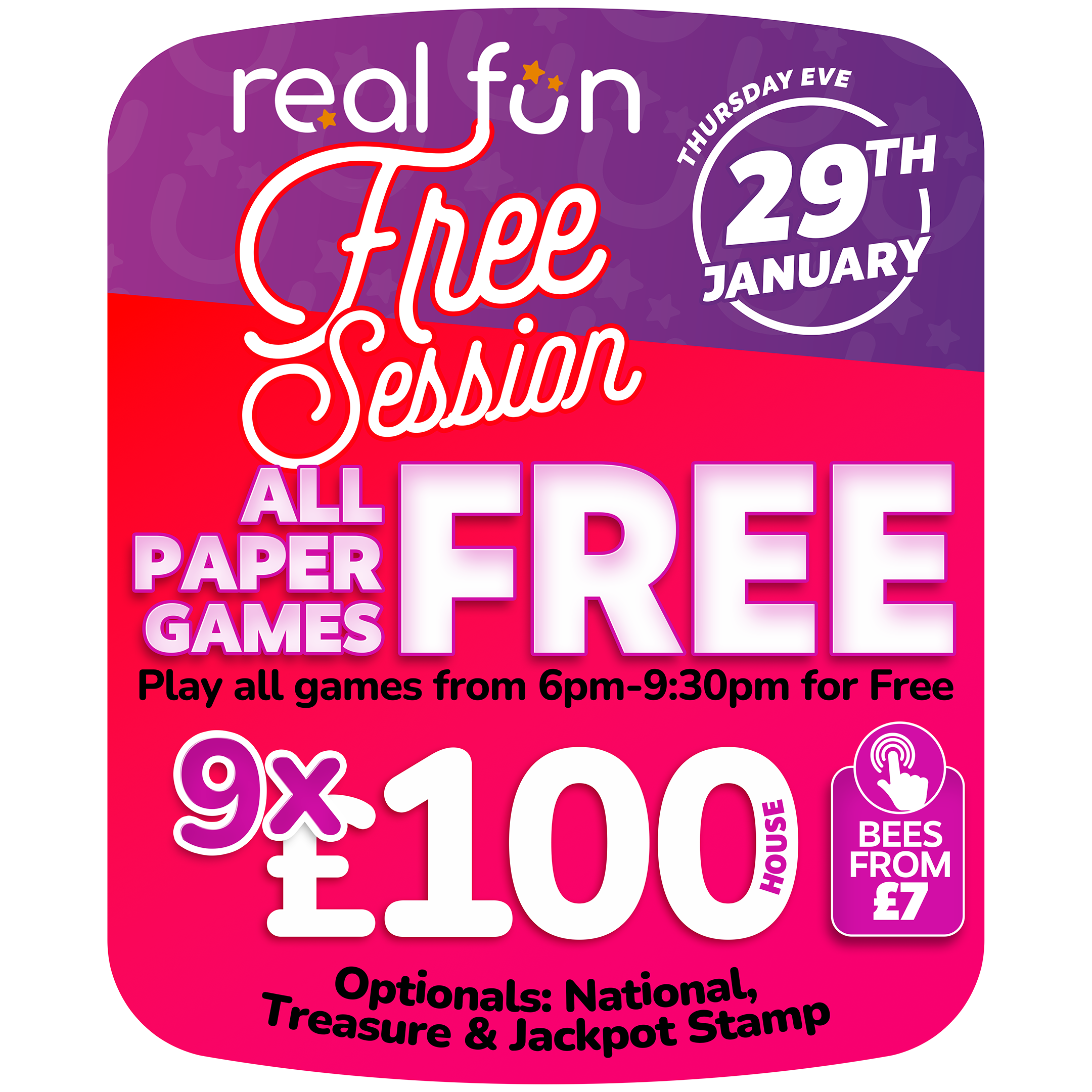 | Main Session (Real Fun Flyer, 10pg Book w/Mega Link, 2x Sweet 16) £2 | 7.30pm |