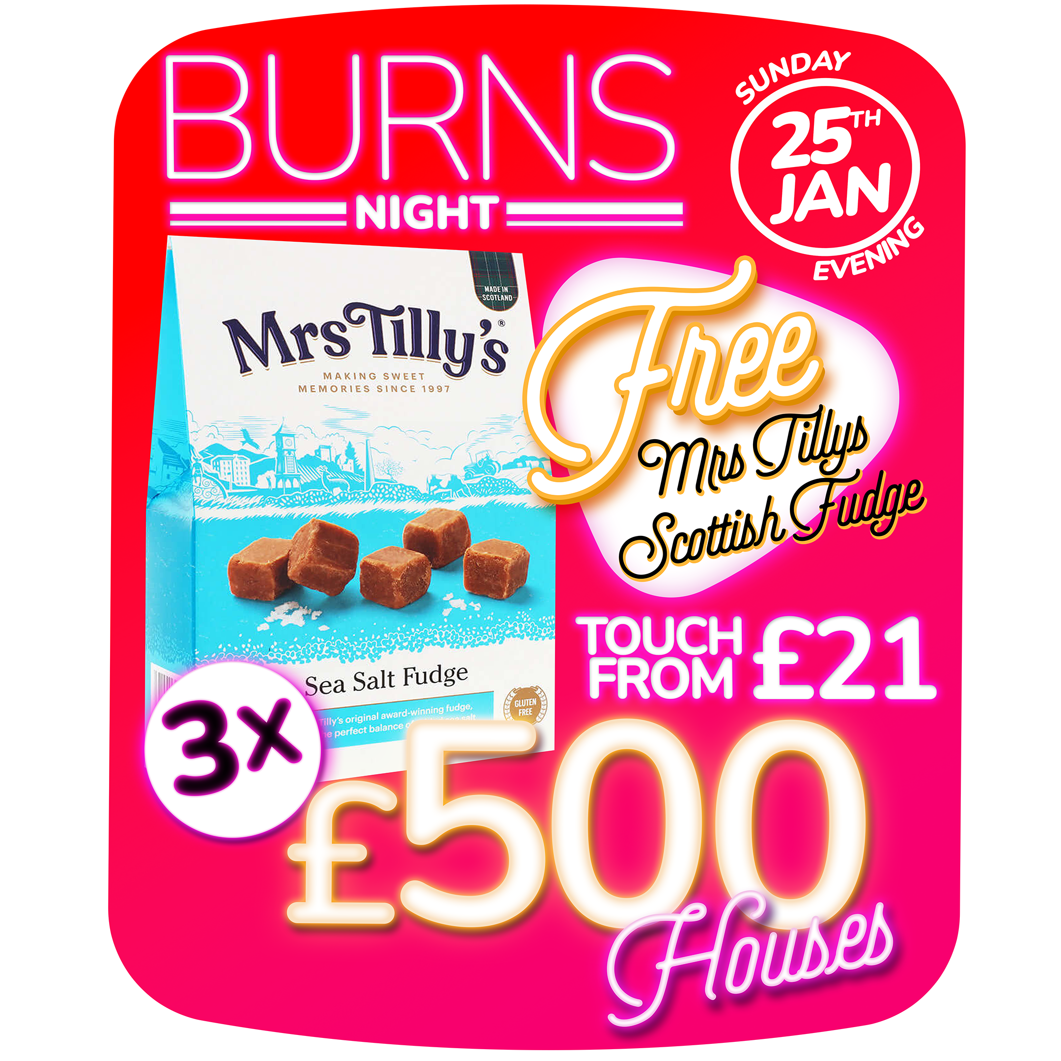 | Evening | 3x £500, 3x £100, 3x £50 Full Houses |